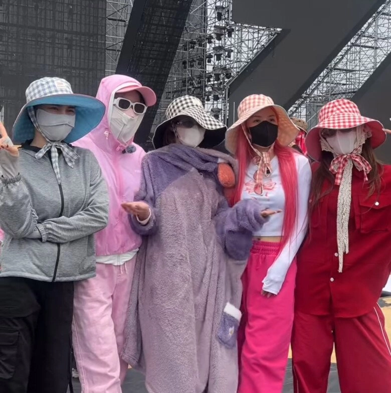 Nhìn hình ảnh với thời trang chống nắng nóng này thực sự khó nhận ra ai là ai ngoài chị đẹp Trang Pháp có mái tóc màu hồng.