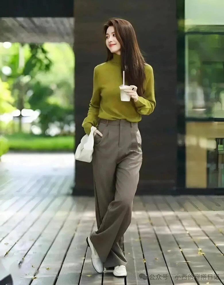 Áo len cổ lọ màu xanh lá cây kết hợp với quần ống rộng màu xám, mang đến cảm giác đơn giản nhưng cao cấp. Đôi giày lười màu trắng hoàn toàn phù hợp với độ dài vừa phải của ống quần, như thể đang bước đi trên con đường mùa xuân và tận hưởng hơi ấm của mặt trời.
